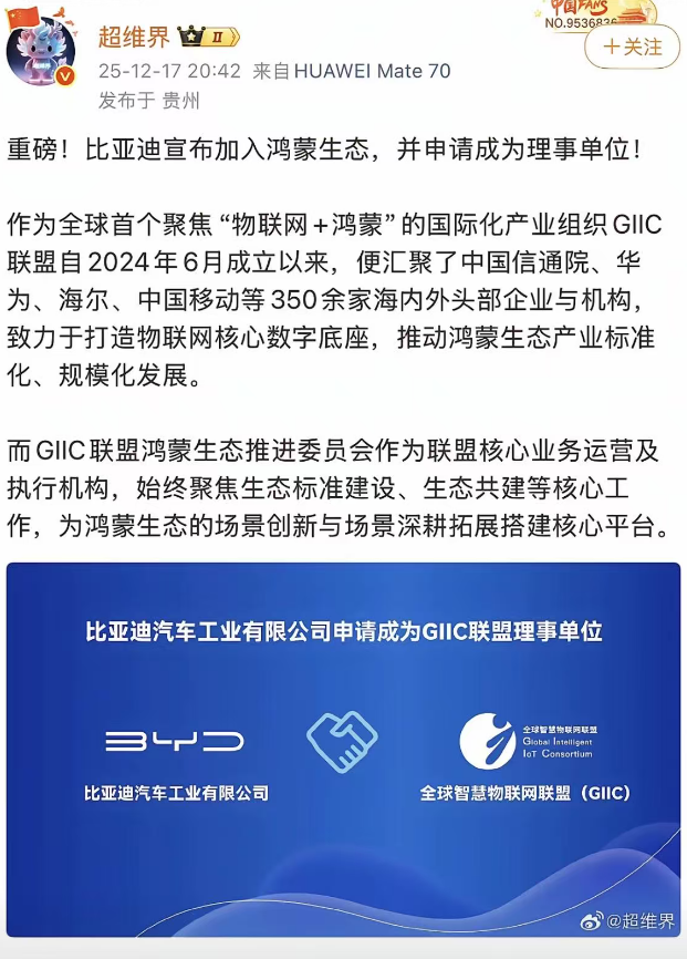 这场合作的意义,远不止于单一企业的生态拓展。它预示着新能源汽车行业的竞争,已从单纯的车辆性能、续航比拼,升级为生态互联能力的较量。比亚迪与鸿蒙生态的联手,不仅将推动行业标准的统一,更会倒逼更多车企和家电品牌加入 “万物智联” 的浪潮。对于消费者而言,这意味着未来的智能生活将更加便捷、高效,车与家的联动将变得无处不在,而曾经的科幻场景,也将逐步走进日常。